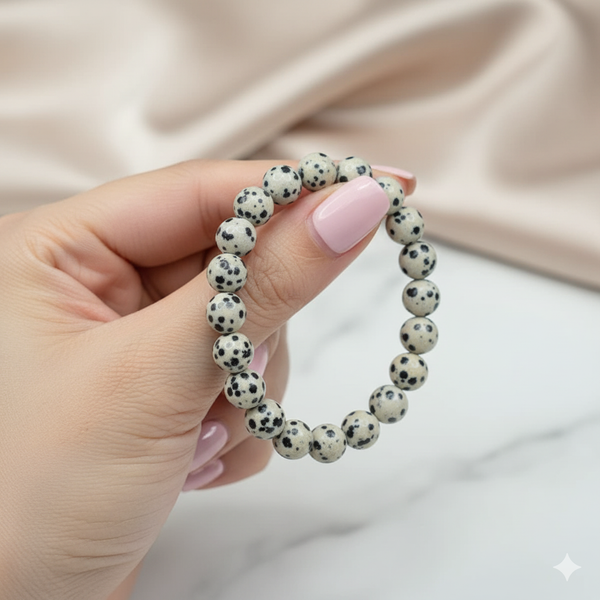 The Dalmatian Jasper bracelet exudes a carefree spirit, inviting prosperity, fostering friendships, and nurturing a deep love for the journey of life. It makes for a cherished gift, a symbol of vitality, whether for oneself or a loved one.